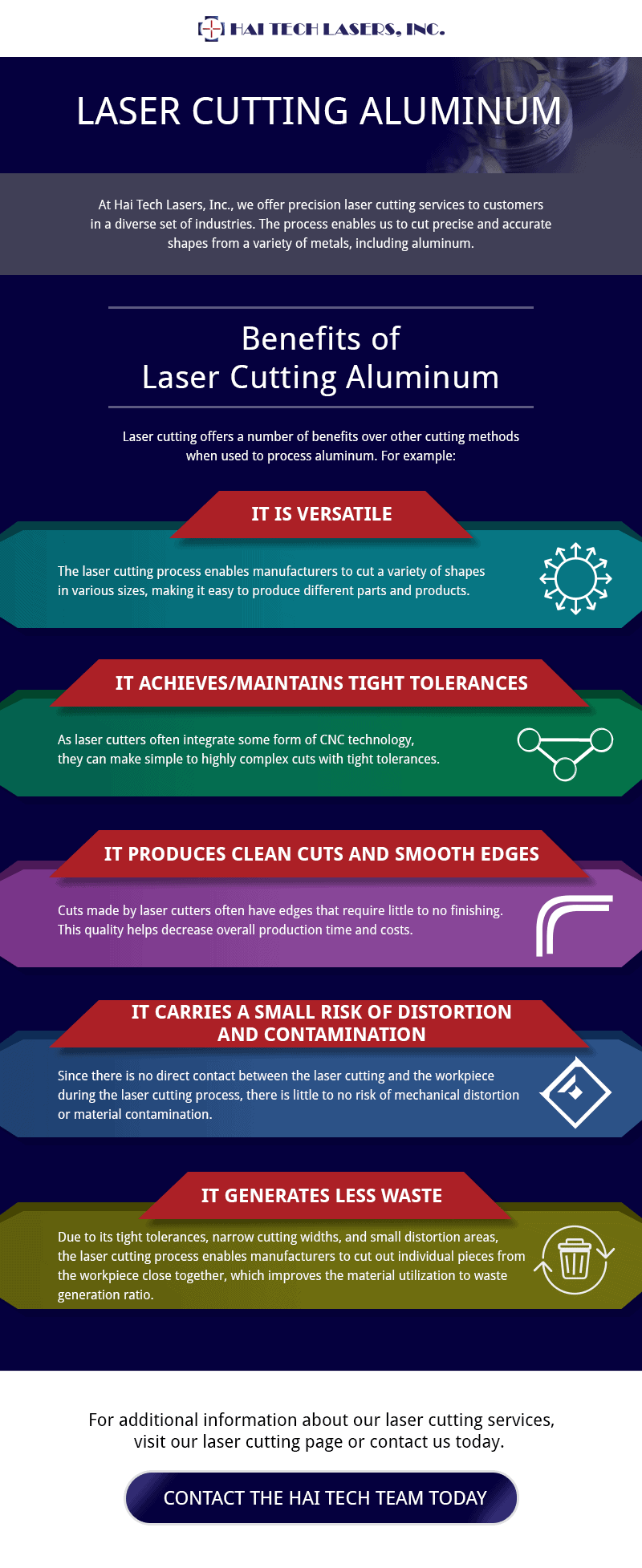 Looking for the ideal laser fabrication partner for your aluminum laser cutting needs? Turn to the experts at Hai Tech Lasers! For additional information about our laser cutting services, visit our laser cutting page or contact us today. To discuss your specific laser cutting requirements with one of our team members, request a quote.
